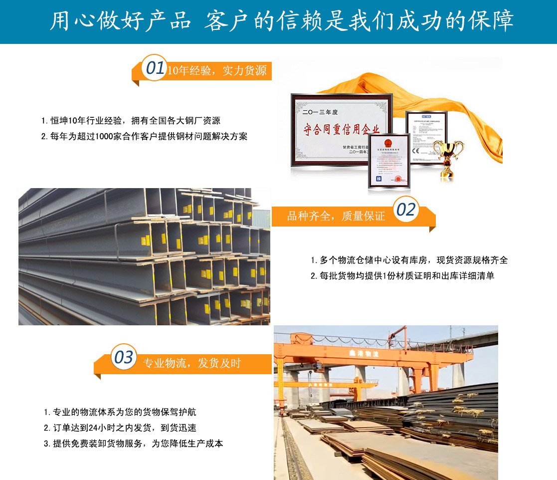 蘭州恒坤商貿(mào)有限公司立足于鋼材貿(mào)易,主要經(jīng)營(yíng):鋼板、角鋼、工字鋼、槽鋼、H型鋼、鍍鋅槽鋼、鍍鋅角鋼、鍍鋅板、鍍鋅卷、鍍鋅圓鋼、鍍鋅工字鋼多種型號(hào)鋼材產(chǎn)品。多年來,我公司始終堅(jiān)持質(zhì)量第一,信譽(yù)至上的經(jīng)營(yíng)方針,與酒鋼、包鋼、八鋼、唐鋼、鞍鋼、萊鋼、兗礦、日照鋼鐵、濟(jì)鋼,成都、天津等多家企業(yè)達(dá)成大批量物資供應(yīng)協(xié)議,并且與省內(nèi)外多家客戶建立了合作關(guān)系。